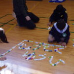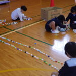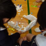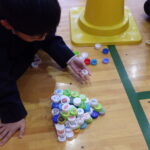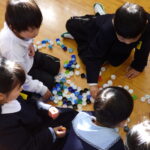 1年生が、心光こども園の年長さんを招待して、交流会を行いました。ペットボトルキャップを使って、積んだり、並べたりして、いろいろな形を作りました。心光こども園の子たちに越部小1年生のみんなが、優しく声をかけたり、キャップの積み方を教えたりして、お兄さんお姉さんになる気持ちが高まりました。