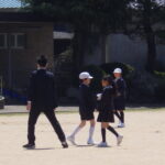 本日、たつの警察署交通安全課、越部駐在所、たつの市交通安全協会の方々にお越しいただき、交通安全教室を開催しました。横断歩道の渡り方、登校旗の使い方を運動場で練習をしてから、信号機のある公道や横断歩道を実際に歩きました。自動車を見ること、しっかりと手を挙げることなど、自分の命を守る行動を確認しながら歩くことができました。